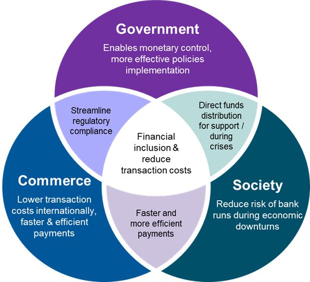 CBDC has the potential to bring benefits to the government, commerce, and society, as shown in the diagram below.