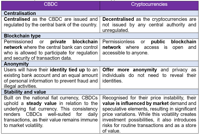 While CBDC is a virtual currency issued by central bank, however, it is different from the cryptocurrencies as outlined in the table below.